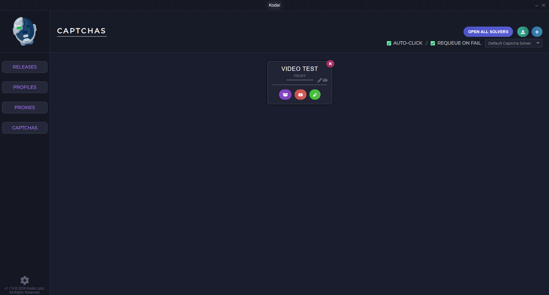 On this page within Kodai you can create captcha solvers to be used with your tasks. Similarly to the profile page, they are given names configured by the users and they have a few settings that you can configure for all of them collectively. Each solver once created can be used on an individual site so your task captcha's will be segregated. You can also test your solver and open up YouTube to generate activity on there.