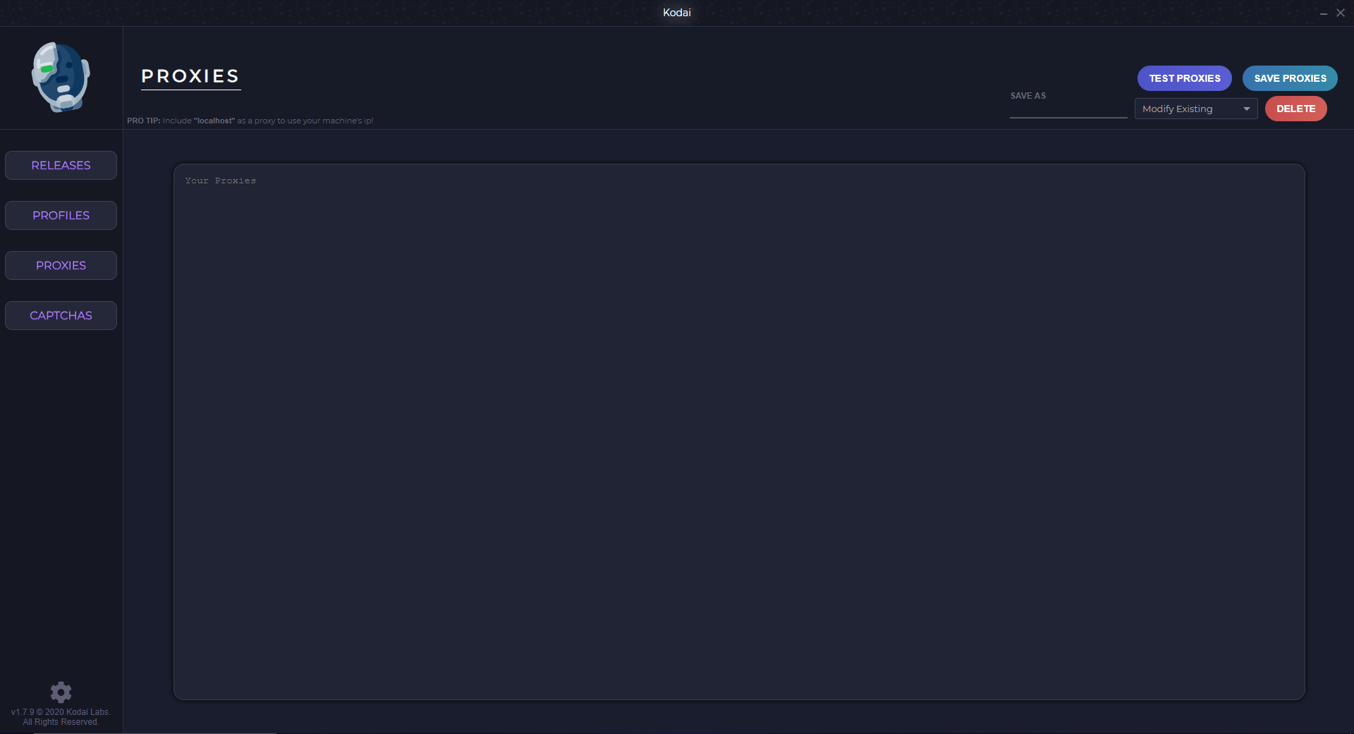 On this page within Kodai you can inject proxies into the bot to be used with your tasks. Once you enter your proxies you will need to save them under a proxy group name and then you can test all the proxies to ensure they are all working. You can also delete groups at any point collectively to save time for the user.