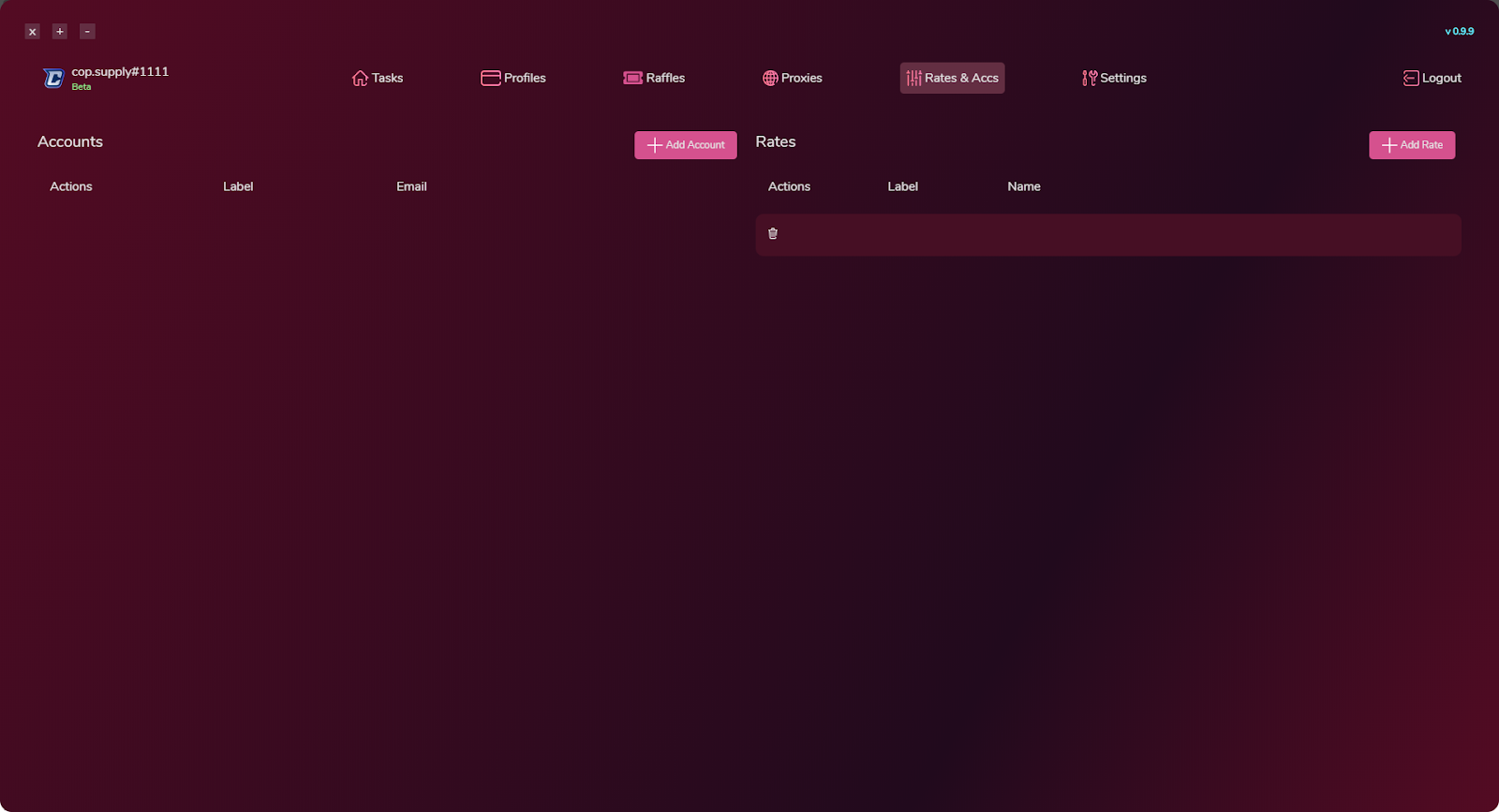 On this page you can add rates and accounts into Kilo which you can then inject into your tasks for better efficiency. To add accounts you can hit the “Add Account” button which will then prompt you to enter an email, password and a label for labeling purposes. To add rates you hit the “Add Rate” button which will then prompt you to enter the shipping rate text and shipping rate label.