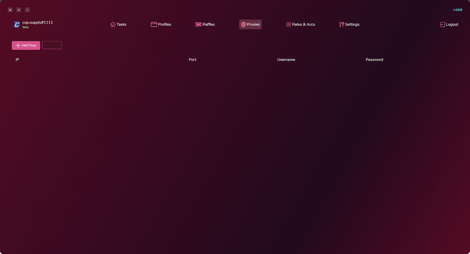 On this page you can enter proxies into Kilo which can be collected into proxies groups and viewed in that form. Once you enter proxies you can name a group to distinguish the proxies apart and once you create multiple groups you can select them from the dropdown next to the add proxy button. If you want to view all your proxies there is a view all proxies button to manage all of them. Once you have all your proxies you can inject them into your tasks so they can be used together.