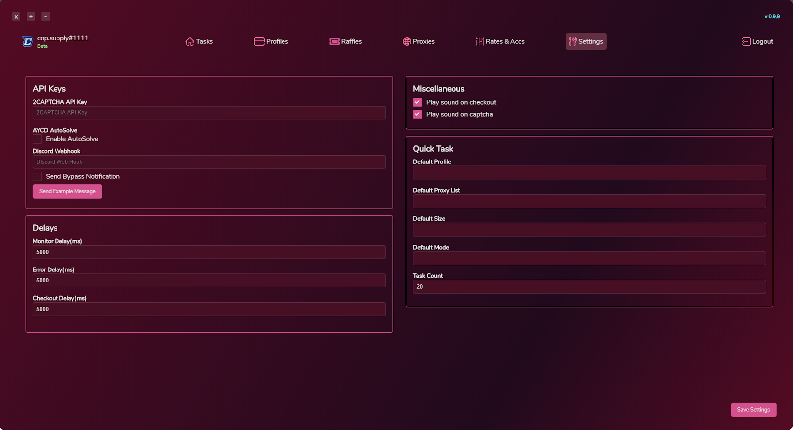 On this page you can configure certain settings on this page which can affect your tasks. You can enter API keys to help solve your captcha’s, you can configure your delays based in MS, you can amend the sounds that the application makes and finally you can edit your quick task settings. Once you are done you can save your settings through the “save settings” button.