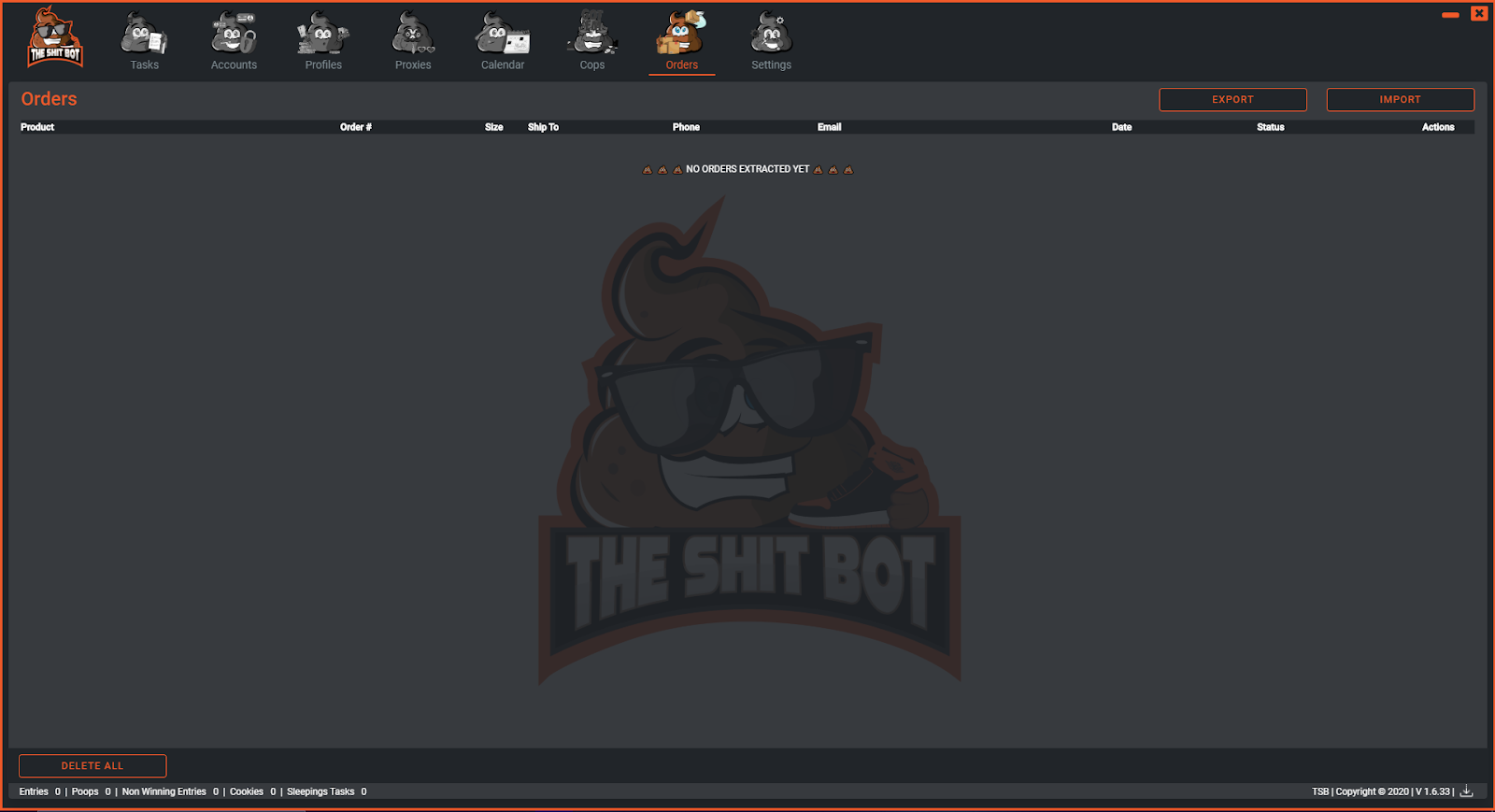 This is the orders page within TSB and this works tightly with the cops page. Every order that is within the bot is broken down into a few headers to better manage the orders. The order will be broken down into the product the order is, the order number, the size of the item, the address, the phone number, the email for the order, the date of the order, the status of the order and the actions associated with the order.