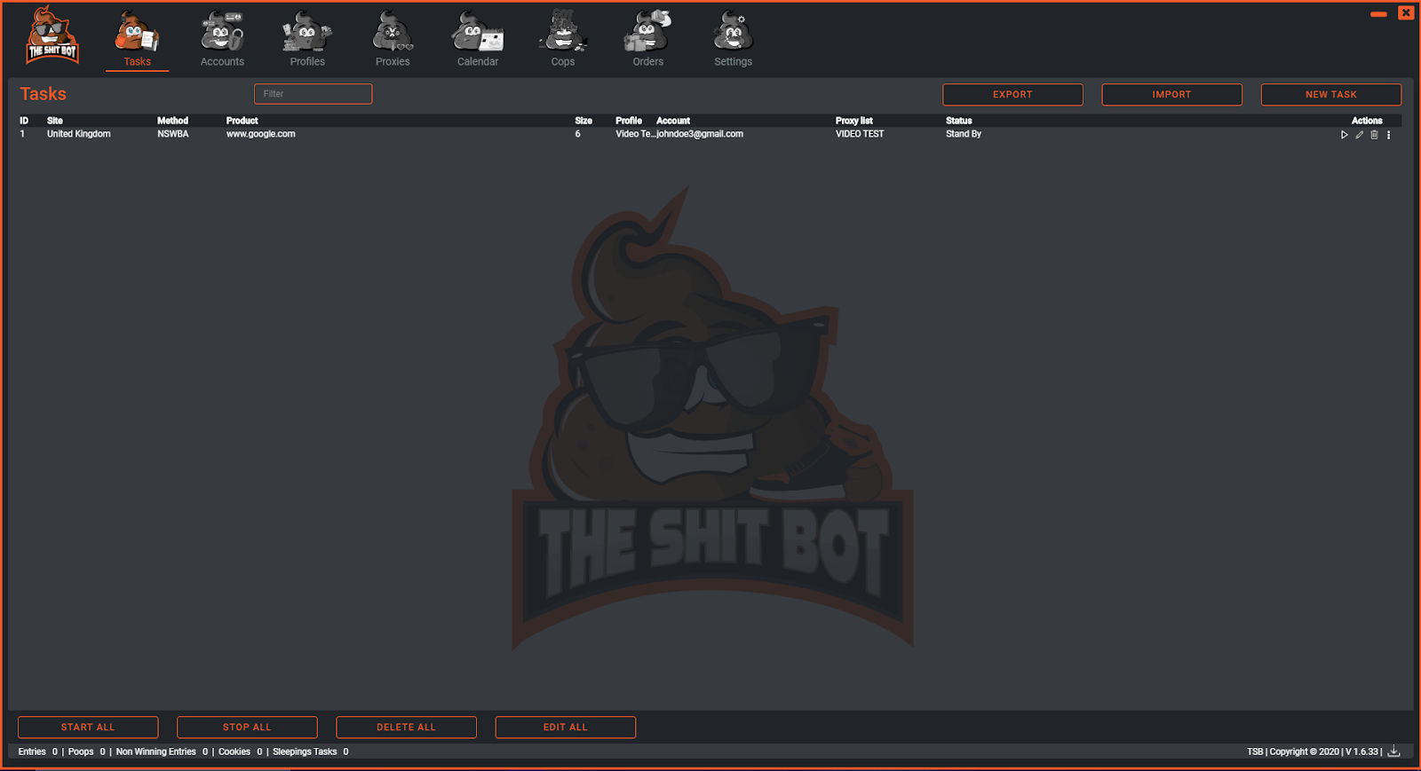 This is the tasks page within TSB which is where you can create tasks as well as view your tasks you have created. All the tasks you create have been categorized into a bunch of headers so you can see everything broken down. The headers are the ID for the task, the method you configure, the product URL, the size of the item, the profile you are going to be using, the account you will be using, the proxy list, the status and the actions available for your task. At the bottom left of the page you have a few buttons that are dedicated to affecting all the tasks you have created, such as starting all, stopping all, delete all, and edit all tasks. Towards the top of the page you have the export button to export your tasks, the import button to import tasks into TSB and the new task button to create a task.