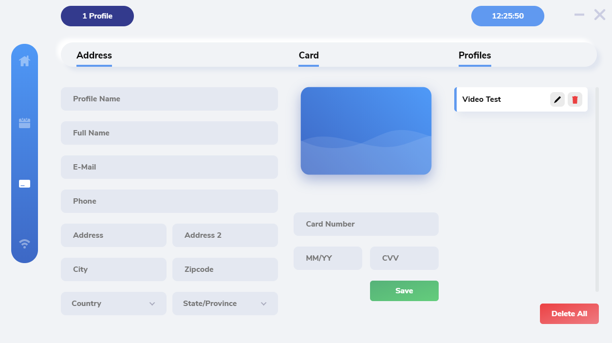 On this page within Spectre Supreme you can create a billing profile to be used with your tasks. Once you create a billing profile it will be available to view, edit and delete on the right side of the page. They also have a card graphic model on the page so the details are visualized as you enter them.