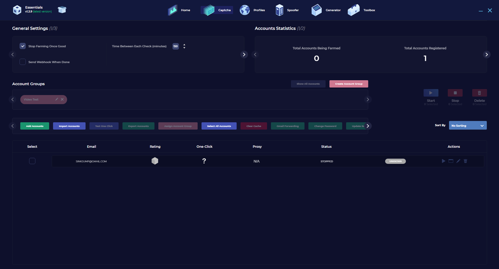 On this window, you can view everything regarding strengthening your captcha scores through Essentials. You can configure the general settings at the top of the page and view some account statistics in regards to your account within Essentials. Below that you can view the account groups in which you can add accounts to those groups, below that is where all your added accounts will be held and also segregated into different sections such as email, rating, one-click,proxy,status and some other actions too.