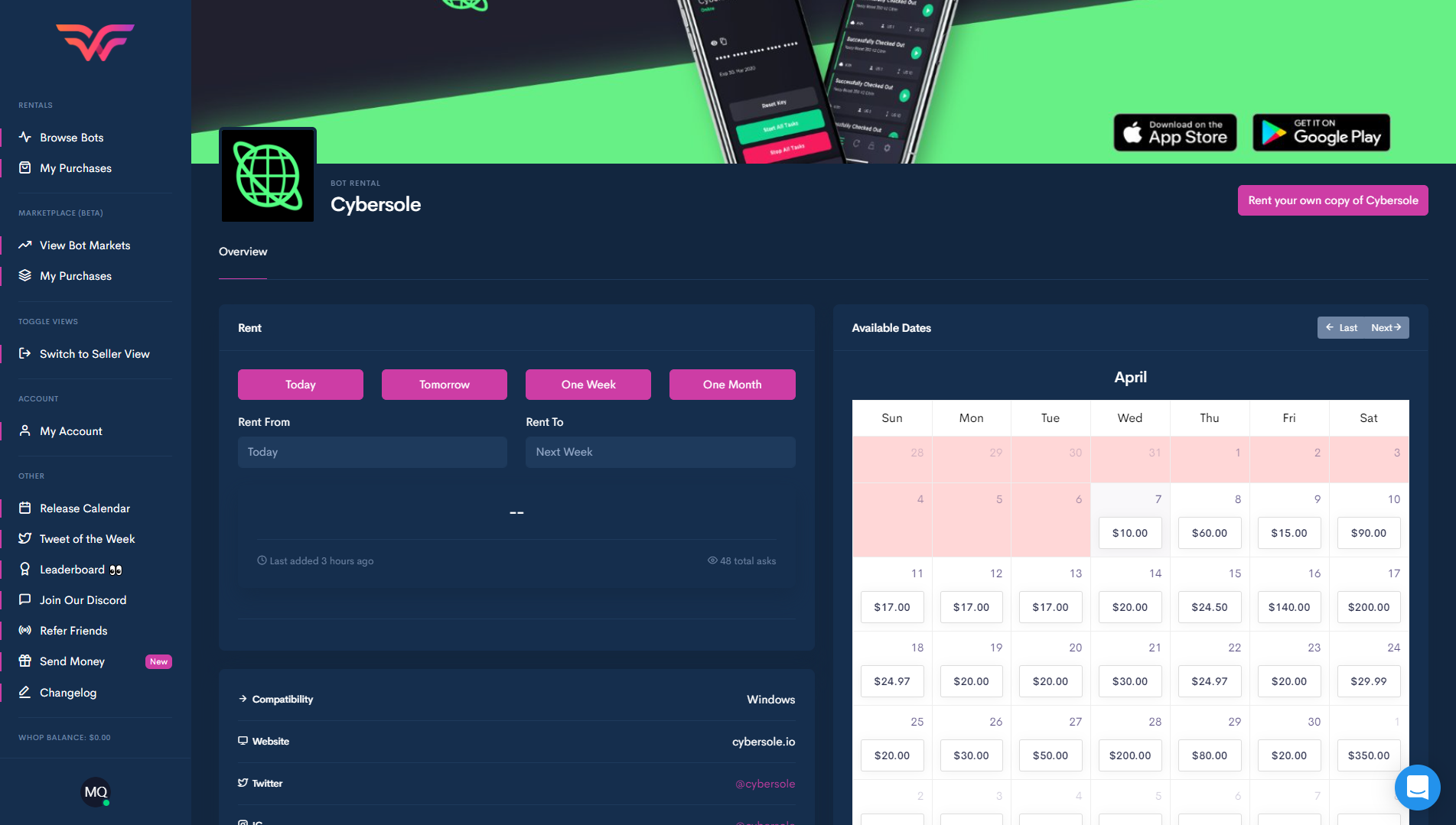 On this page within Whop, you can buy a rental for any bot, the example above is for Cybersole, however, this will look the same for any bot that's on the platform. On the left side, you can configure the data you want to rent from and the date you want to rent to, you can also click on preset time period buttons if you don't want to configure it specifically. On the right side, you can view the available dates as well as the prices for those dates. Finally, you have some information about the bot on the bottom left side and you can rent your own copy of Cybersole by clicking the button on the top right.