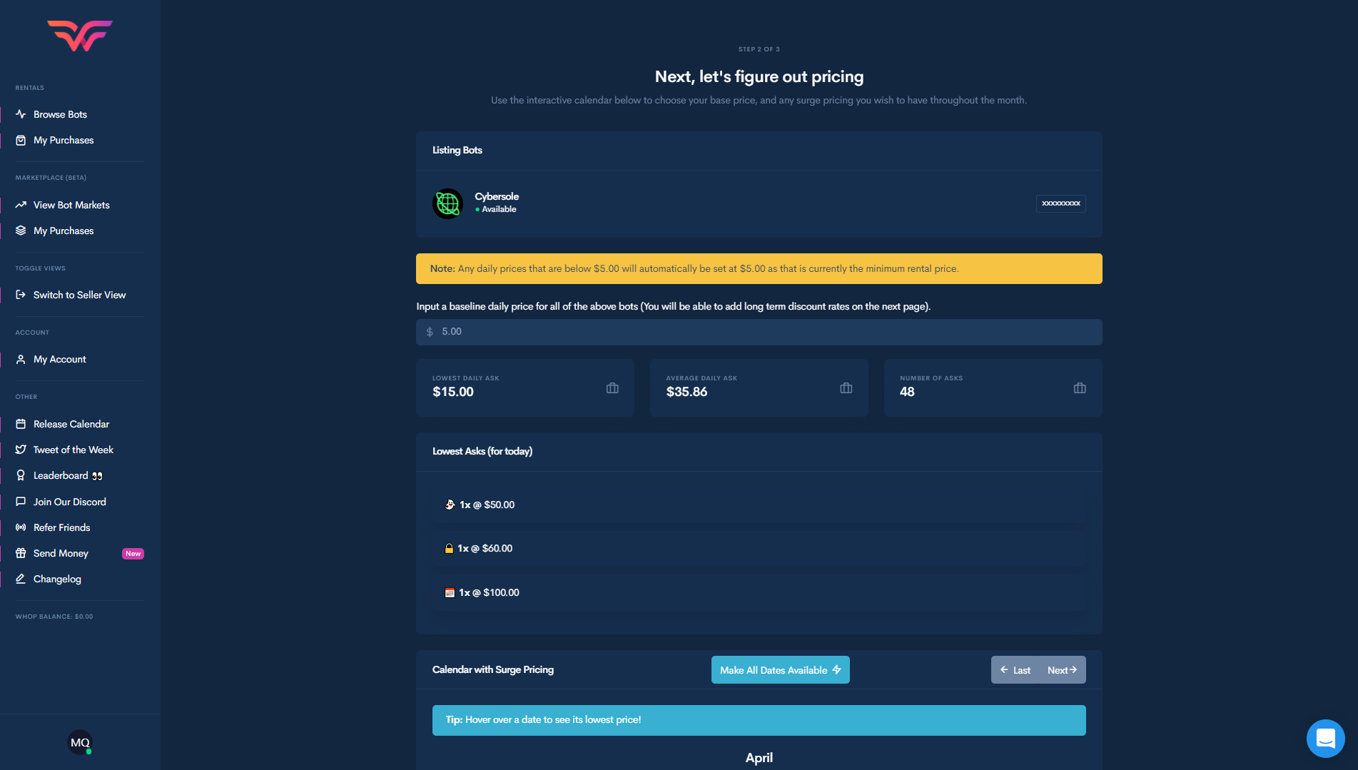 On this page on Whop, you can view the process of selling a rental on their platform. It is important to note that your key has to be verified before actually being granted the permission to rent out on their platform, the first step is to select the bot from the your bots on the platform that have been verified. Then you will be shown this screen, you can view the bots that you are going to list as well as the key. Below that you can input the baseline daily price for the bots you are listing, below that section you can view the lowest daily ask, average daily ask and the number of asks. Below that section you can view the lowest asks for the day and then you can also view the calendar with surge pricing.