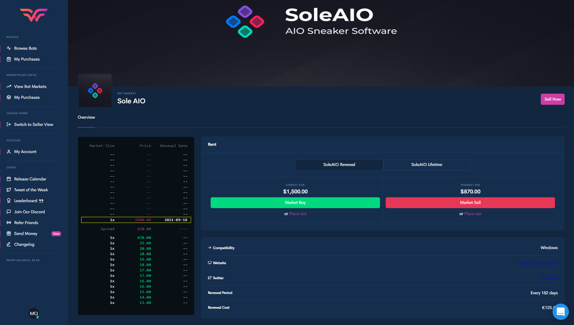On this page on Whop , you can view the market for one bot, in the example above we are looking at the market for Sole AIO. This page will look the same for all the bots with the exception of the market data. You can filter the data between the different types of copies available for the bot, commonly the types of bot copies are renewal or lifetime. Then for every bot type, you can view the lowest ask, highest bid and you can place a bid as well as an ask. On the right side you can view the market for the bot and on the right bottom side, you can view some information about the bot. Finally, you can click the “sell now” button if you wish to sell the bot.