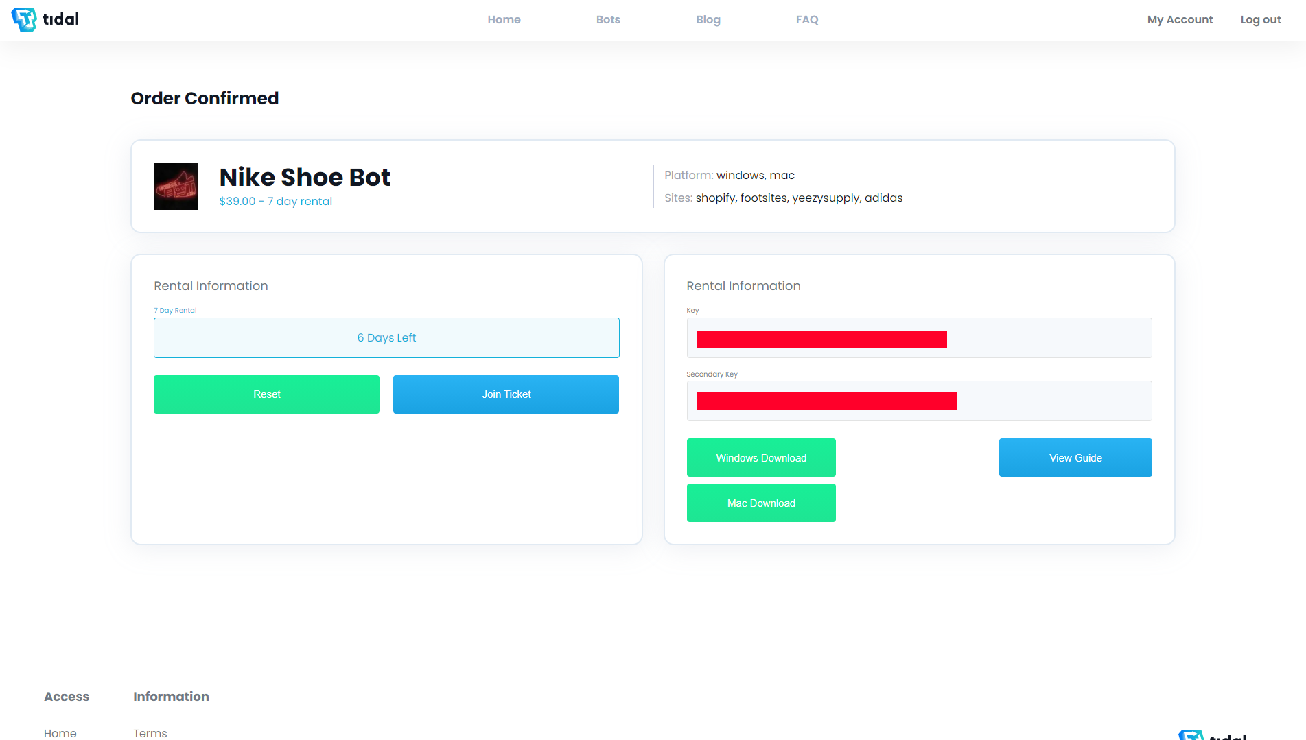 Once you have purchased your rental you will be able to view your confirmation which gives you everything you need to use your rental. You can view the details of your rental on the left side as well as the information regarding its expiry. You have the option to reset the key or join the ticket with the renter so you can communicate further. On the right side you can view the platform that the bot supports as well as the supported sites. Below that you can view the rental information, the download for the bot and the guide for the bot.