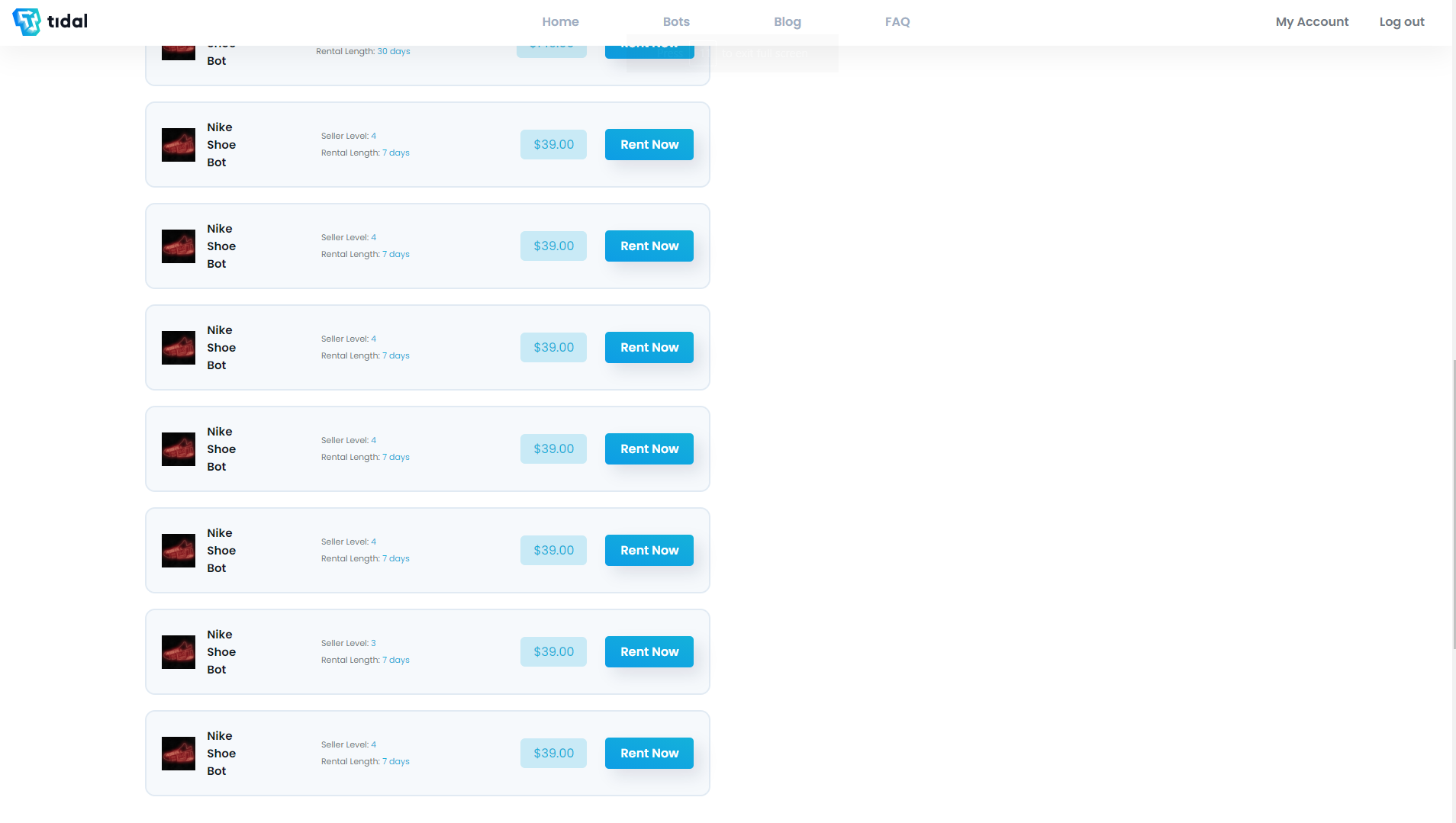 Once you have selected a bot to rent, you need to choose a listing to purchase. You can see what each listing entails and what price the renter is asking for. For example, you can view the rental length, meaning how long you will have the bot rental for, then you can view their asking price. If you're happy with the listing, you can click the rent now button to continue the process of renting a bot.