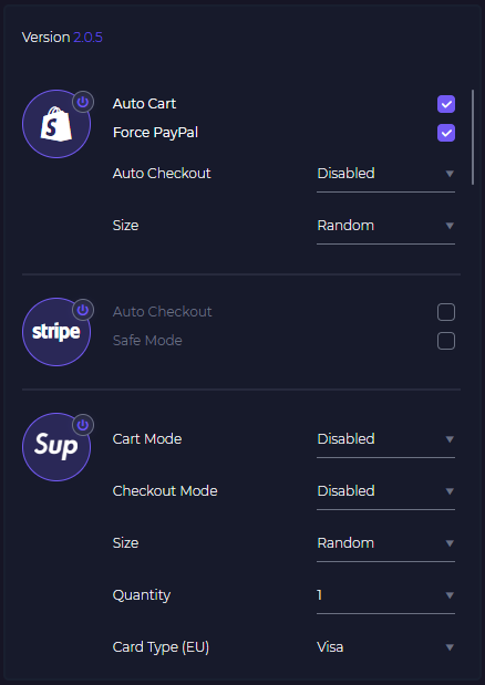 Supported sites: Supreme, Shopify, Demandware, Shoepalace, Stripe, Panagora, Bigcommerce, Off–white and Individual sites.