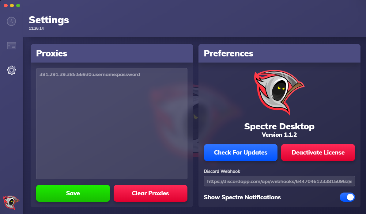 On this page within the bot we can load proxies into the bot that we can use in association with our tasks, with this we can also manage our discord webhook configuration so if we do secure success it would be directed to the webhook. We can also check for updates by pressing the button on this page and deactivate our licence for the bot.