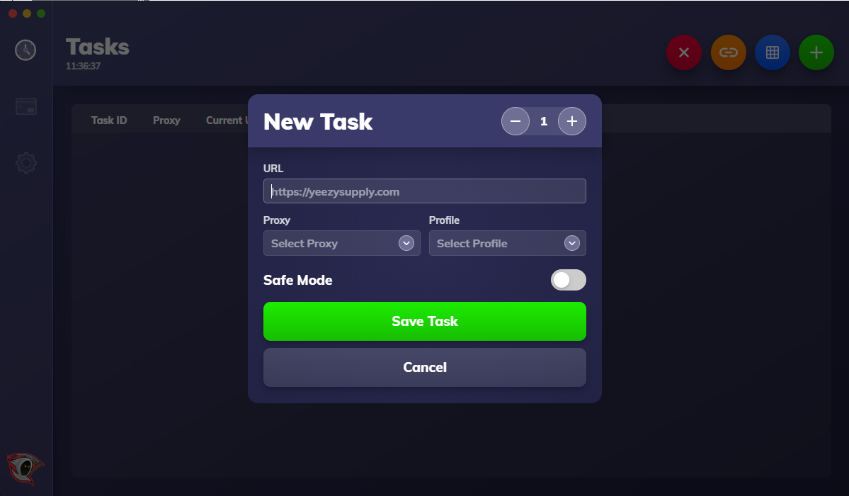 On this page we can utilise everything we have mentioned above to create a task within the bot. We would first need a URL to direct our task, once you have entered this then we can select a proxy from the ones we loaded earlier and select a profile from the dropdown that is available. We can choose to toggle safe mode if we wish and when we are done we can hit the save task button to create the task.