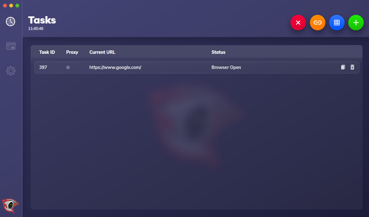 On this page we can view all our created tasks from the task creation page. Per task we can see the ID of the task, the current URL of the task (this would change as it goes through the website) and the status. The proxy indicator will turn green if the task is utilizing a proxy and we also have two buttons which delete the task and duplicate the task if we wish to do that. The button at the top of the page allows us to delete tasks, push a mass link change to our tasks, equalize all our tasks and add a new task.