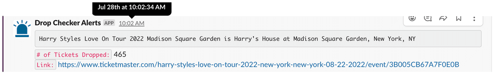 After public sales have ended, tickets are often released at random points in time up until the event date, in what are called “drops”. This is true of both fully sold out events, or events with tickets still available. How do you know when drops happen? You can subscribe to a drop checker tool that automatically finds when these drops occur, and notify you immediately so you can buy tickets that had previously been sold out. To get a more detailed overview, you can check out this video demo.