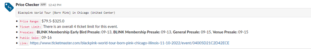 Fortunately, using a price checker you can get a quick overview of presale/onsale dates, ticket limits, and price range. Here is an example of an output from our price checker on Broker Buds. To get a more detailed overview, you can check out this video demo.