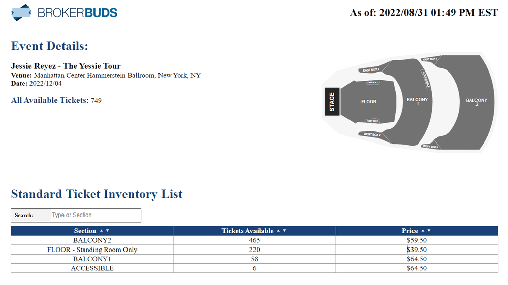 What is a stock checker? In short, it’s a tool that allows you to get a “point-in-time” snapshot of the remaining primary market tickets for any event, including seat locations and price points. Here is an example output using the Broker Buds stock checker tool. To get a more in-depth look at this tool, you can check out this video demo.