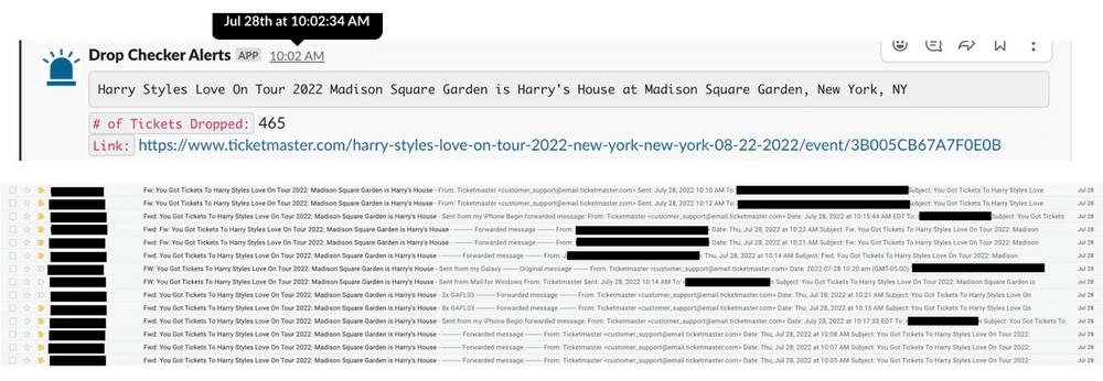 Keeping with the Harry Styles NYC example, here is a screenshot of a drop alert we received in the Broker Buds Slack from our drop checker tool on July 28th last summer. We were then able to buy 50+ standard pricing GA Floor, prime lower bowl, and cheap tickets which we then sold for large profit.