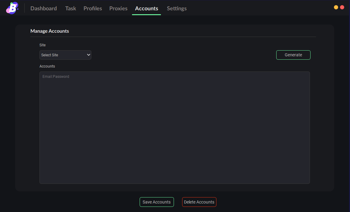 On this window within BurstAIO, you can store accounts for certain sites but also generate sites to be used with your tasks. Once you add some accounts for a site, you can click the save accounts button or the delete accounts button depending on what you would like to do.