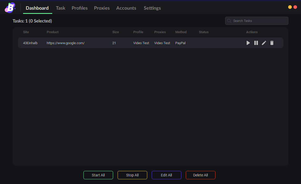 On this window within BurstAIO, you can view your created tasks that been made from the “task” page. Once you have created a task, the information of the task will be shown under a variety of headers. Finally, at the bottom of the page you can utilize the collective buttons that will affect all the tasks on this page.