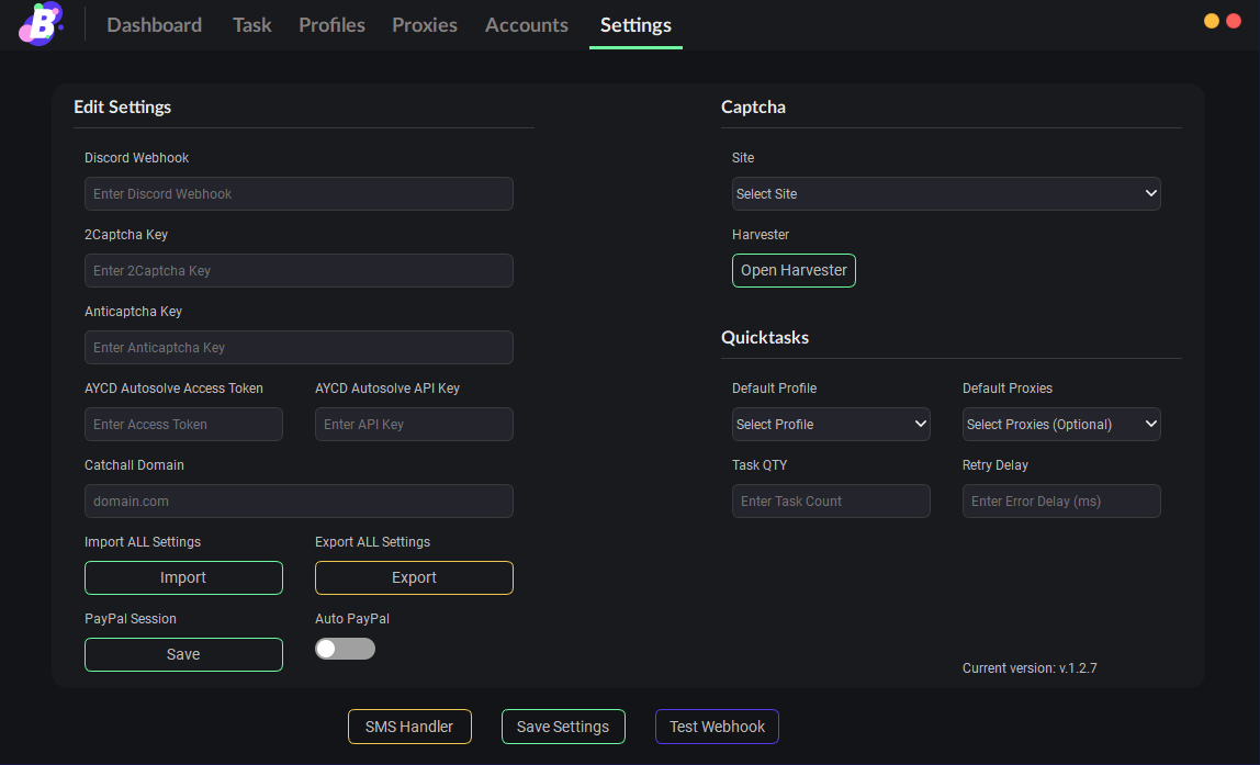 On this window within BurstAIO, you can configure the settings for the bot. You can configure the webhook, captcha harvesting capabilitiesm captchall domian, quick task settings, paypal, launch a captcha harvester and import/export your settings.