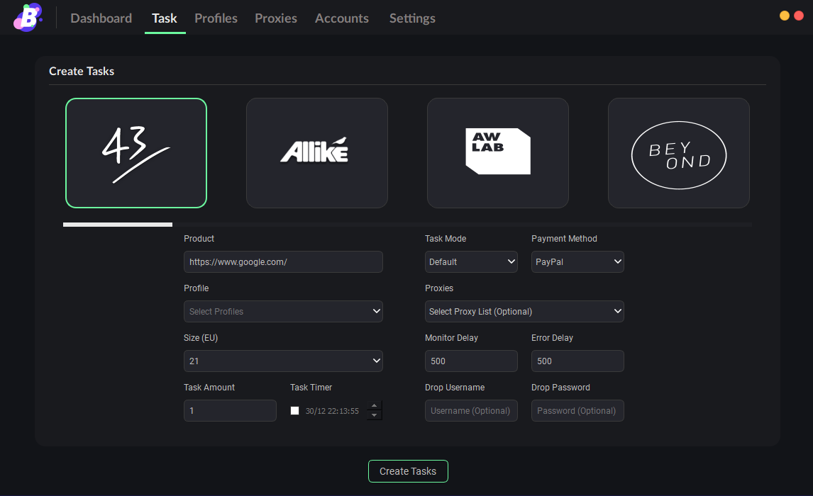 On this window within BurstAIO, you can create tasks that will appear on the “Dashboard” page. You can scroll through the supported sites, then once you have selected a site you can configure the settings for the task such as the product, sizing, delays and much more.
