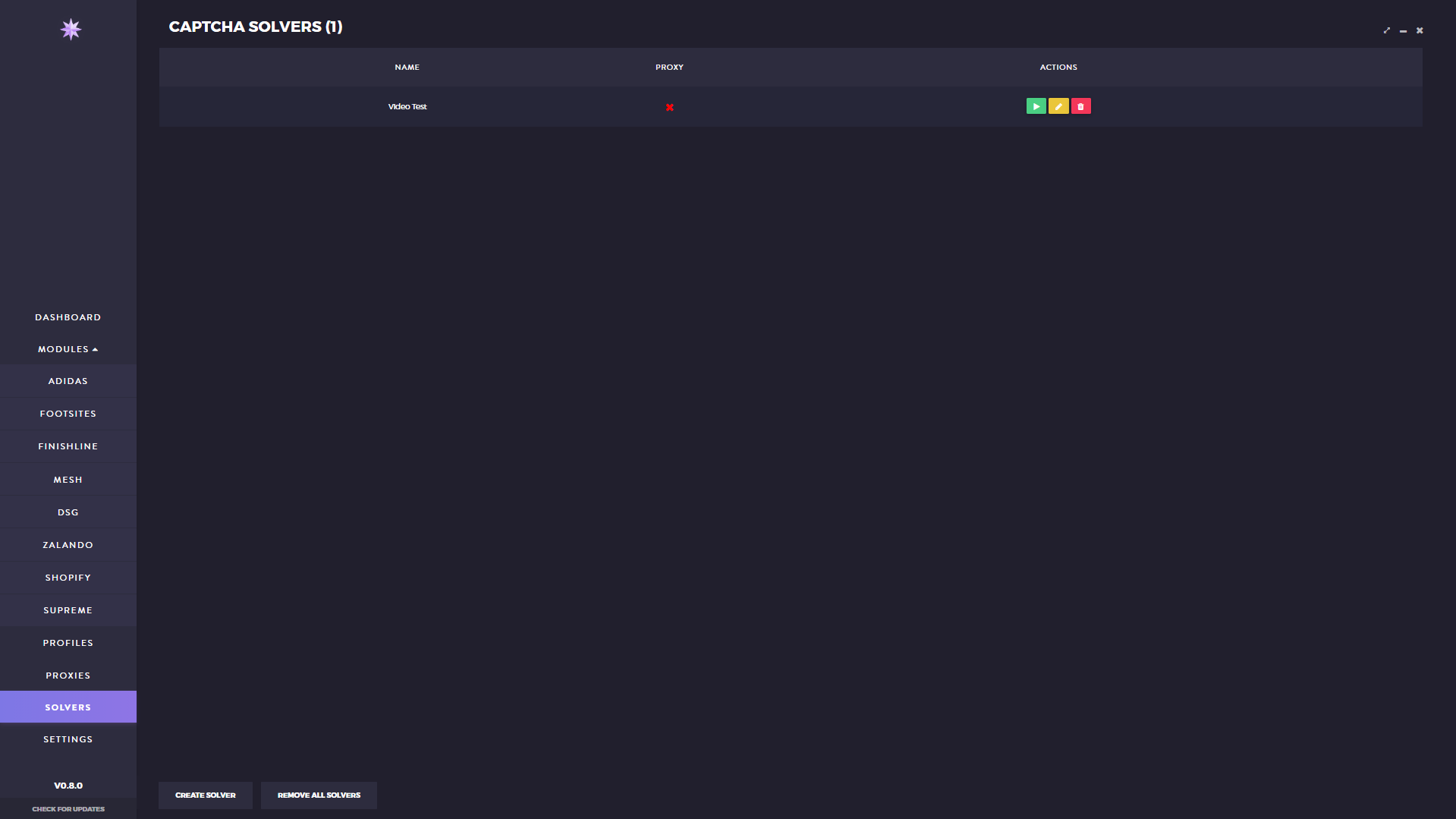 On this window within Polaris you can view and create solvers to be used within Polaris with your tasks. You can create a solver using the “create solver” button in the bottom left as well as remove all solvers using the button alongside it. Once you have created a solver it will appear on the screen under the sections name, proxy and actions associated with that solver.