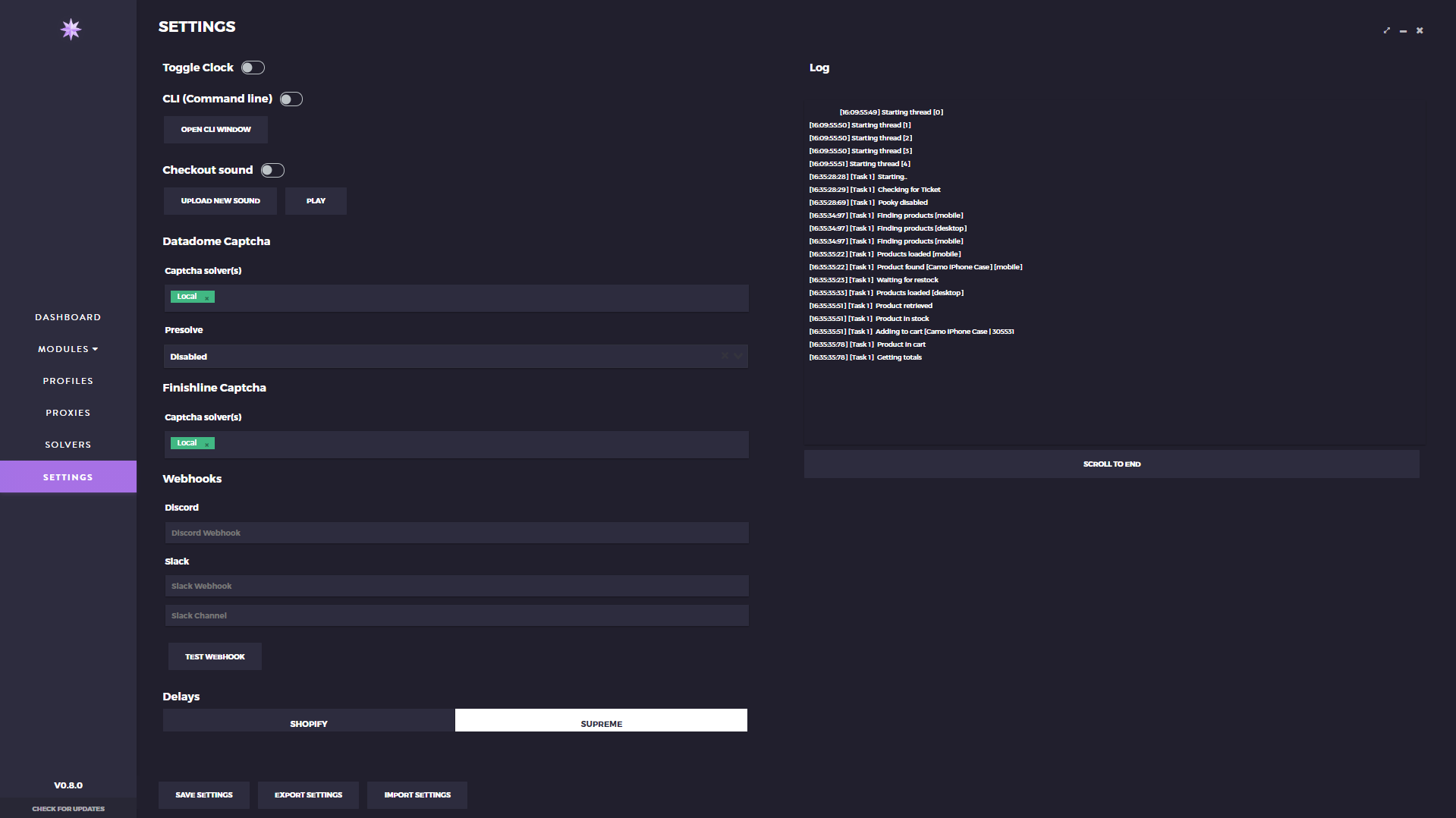 On this window within Polaris, you can view the settings for the bot. You can enable a clock as well CLI, customizable and checkout sounds. You can configure your captcha solvers, presolve and captcha's for finishline. You can then configure your webhooks for both Discord and Slack, you can also test them too. Your delays can configured too on this page and finally, on the right side you can view the log for the bot.