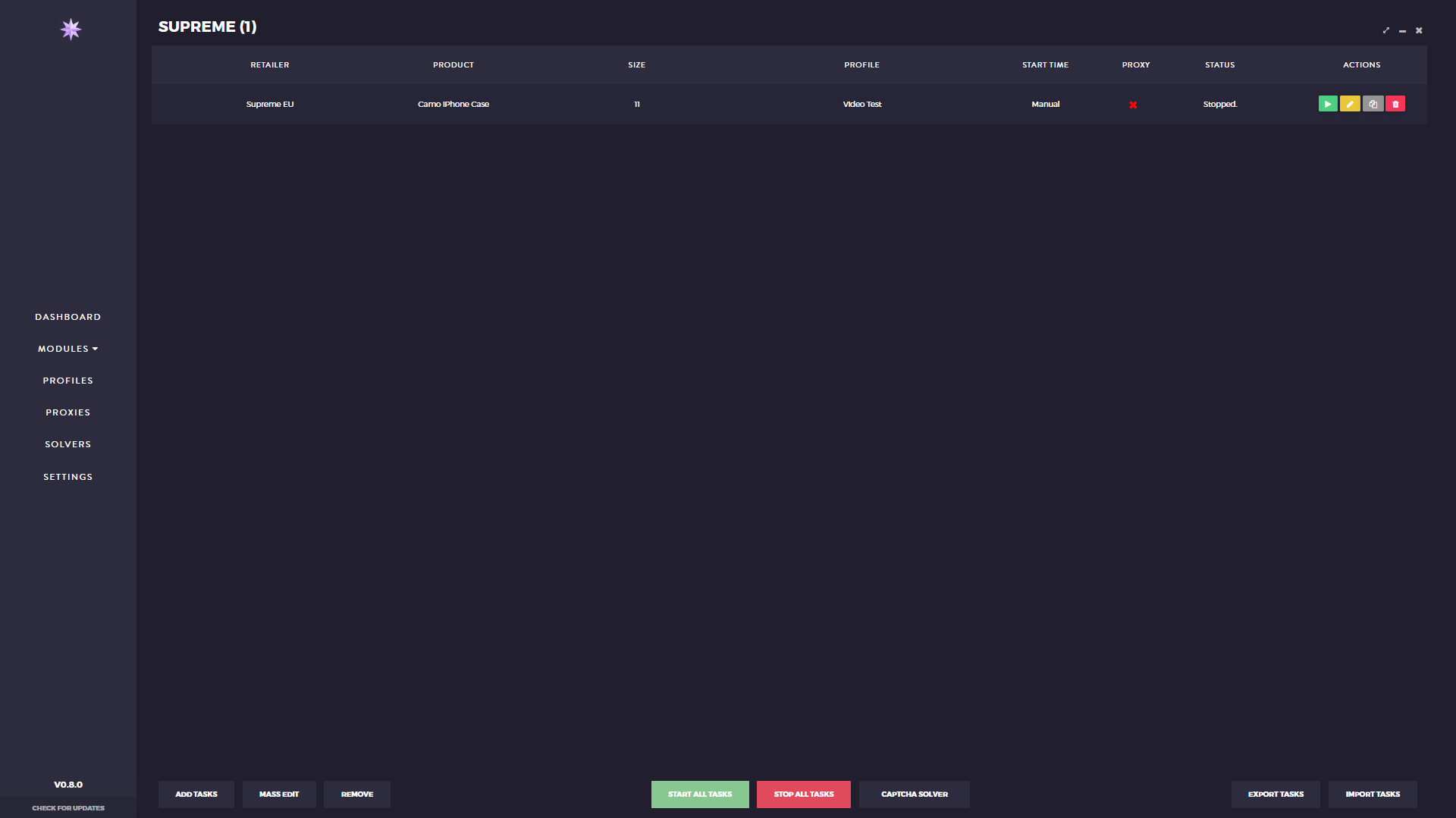 On this window you can view and create tasks within Polaris. It is important to note that in this screenshot, the module selected is Supreme which is reflected above at the top, when you create tasks they will appear in the task section with details about the individual task displayed for you to view. You can add tasks with the button on the bottom left and on the bottom row there is a few collective buttons such as starting,stopping and editing all your tasks.