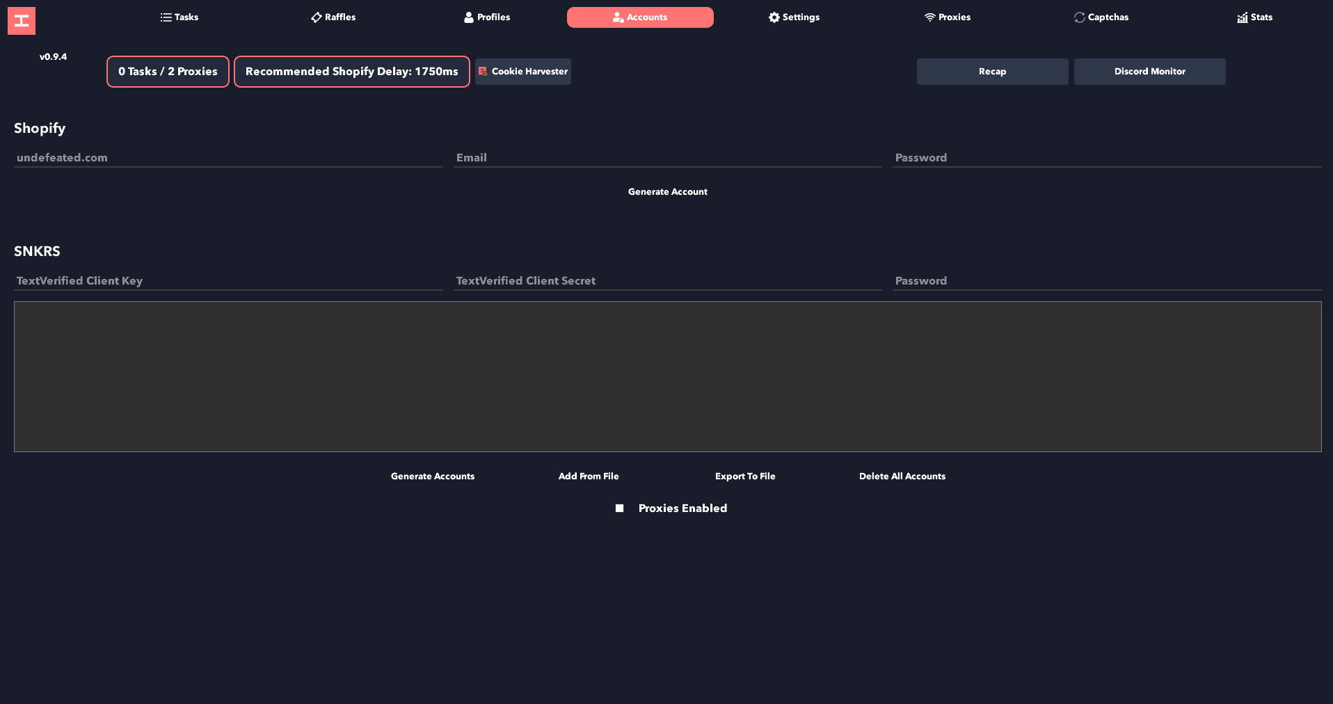On this window you can generate accounts for both shopify and SNKRS. For the shopify section you simply have to enter the store URL entered by the email and password you would like to use for the account. For the SNKRS section you have to enter a TextVerified Client Key followed by the Client Secret and the password. Once you have entered all that information, you can click the generate accounts button to generate accounts, you can also add accounts from file as well export to file once the generation is completed. Finally, you can choose to delete all accounts and enable proxies during this process too.