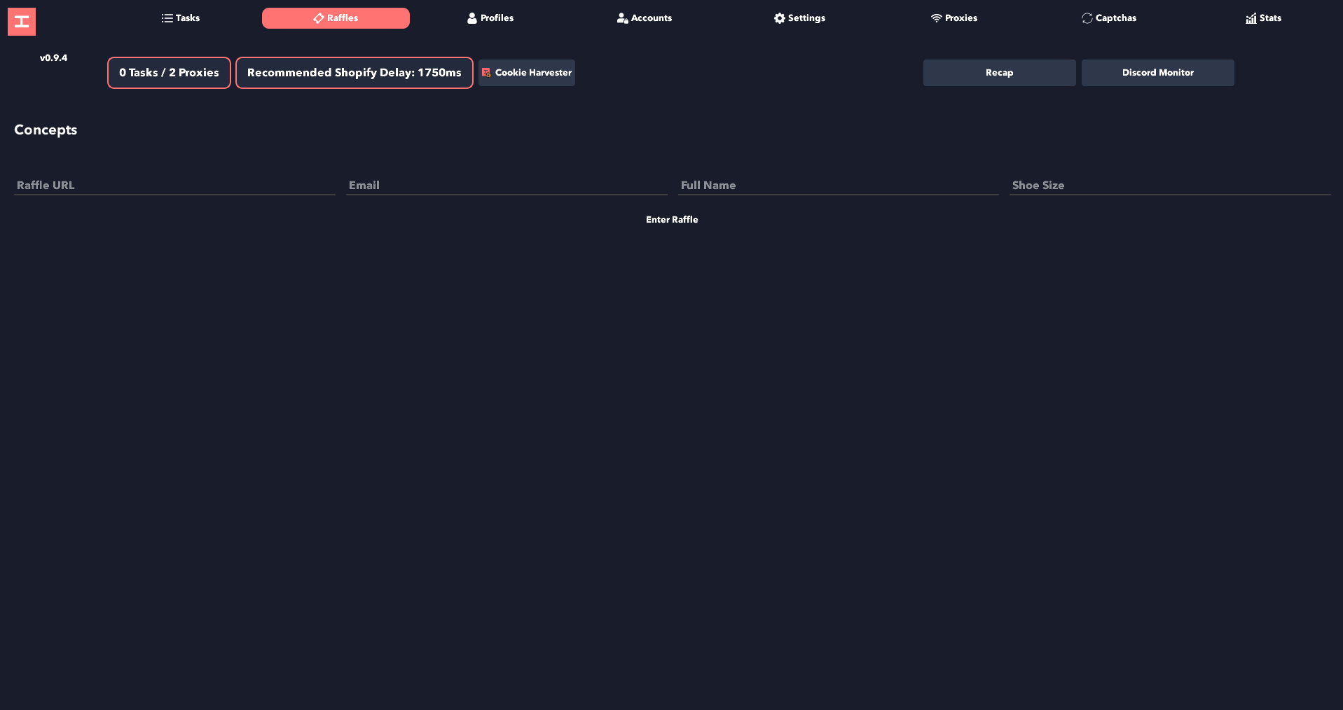 On this window you can enter raffles for the site Concepts. The user has to enter the raffle url followed by their email, full and shoe size. Once all that information has been entered, Hayha will enter that information into the raffle for you after clicking the enter raffle button. Taking into consideration that this isn't a heavily advertised feature, it is definitely nice to have alongside the rest of the bot.