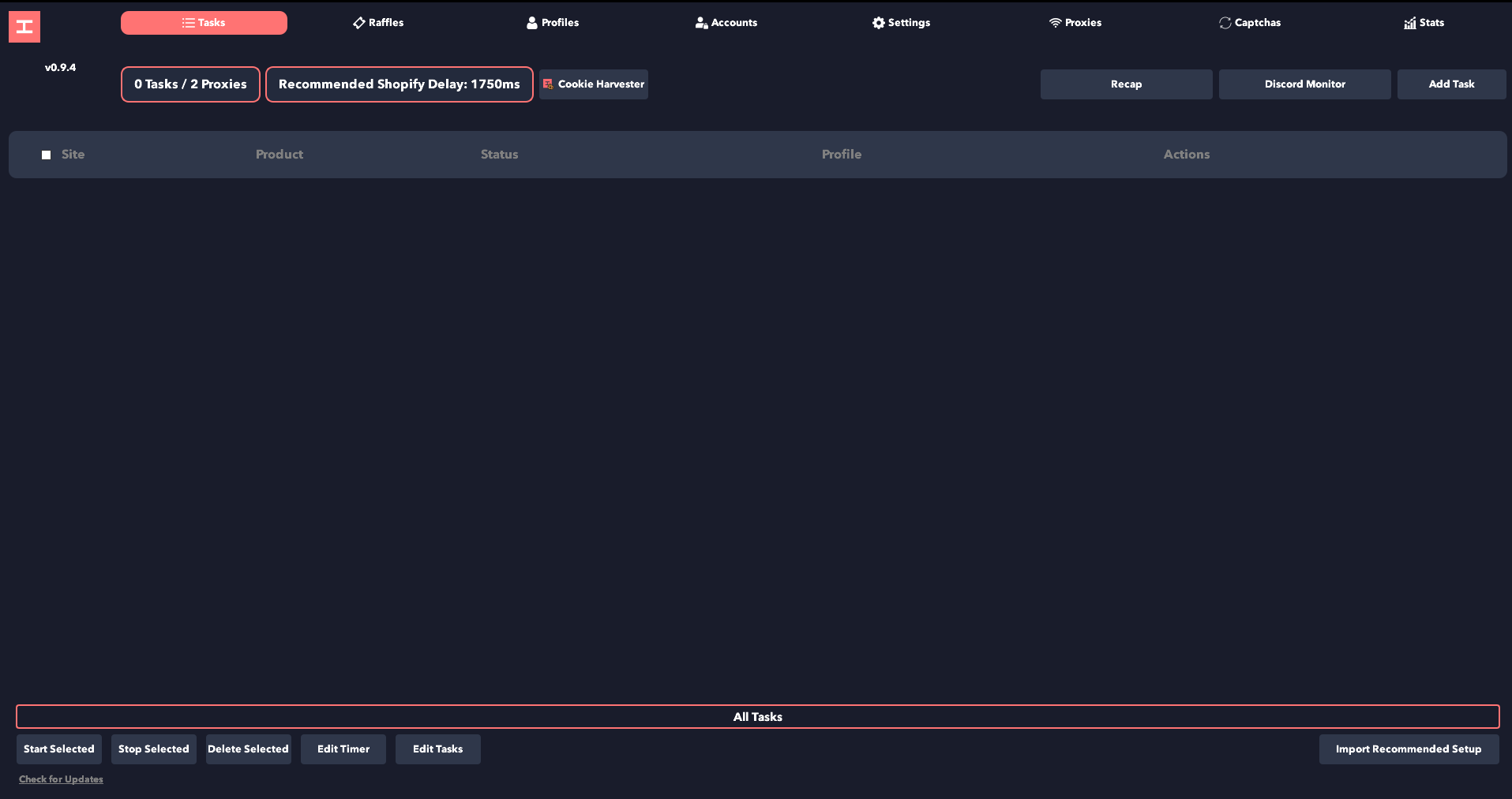 On this window you can view your tasks as well as create tasks to utilise within the bot. You can view the size, product, status of the task, profile being used and the actions associated with the task. All tasks will below the headers just mentioned and below that you have the buttons associated with the tasks. The start select button will start selected tasks, the stop selected button will stop selected tasks, the delete select button will delete selected tasks, the edit timer button will edit the time that all tasks start and the edit tasks buttons will edit all the tasks at once.