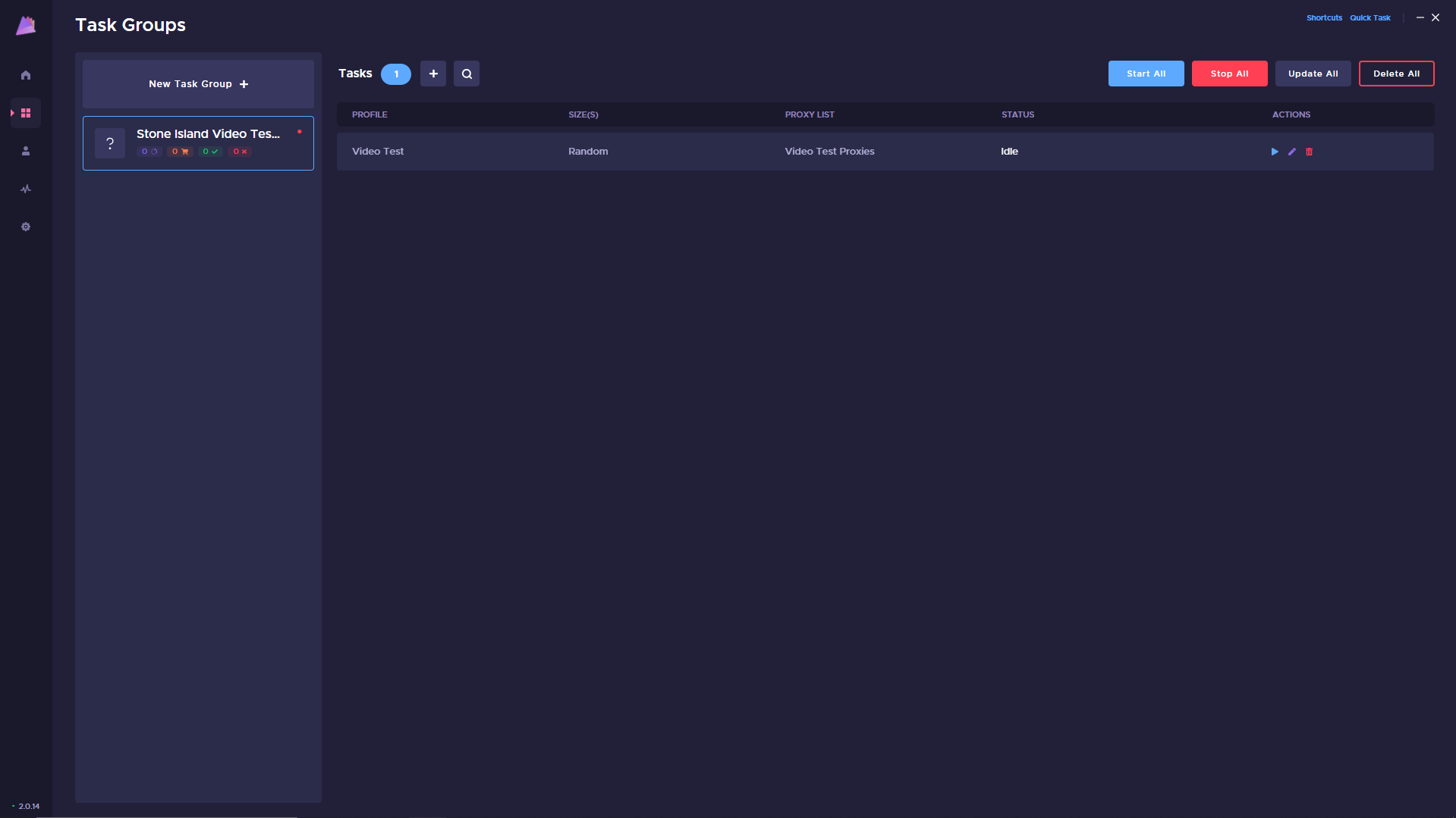 On the task groups page you can view all your created task groups across all the support sites within PrismAIO. Once you create a task group you will see the task group name to distinguish it from others as well as some small statistics on each group to show you how the group is doing in terms of success, failures, carts and captcha's. Once you click into a task group you can create a task by hitting the addition button and once you have created a task it is segregated into a few headers as you can see. Then you are free to start,edit or delete the task.