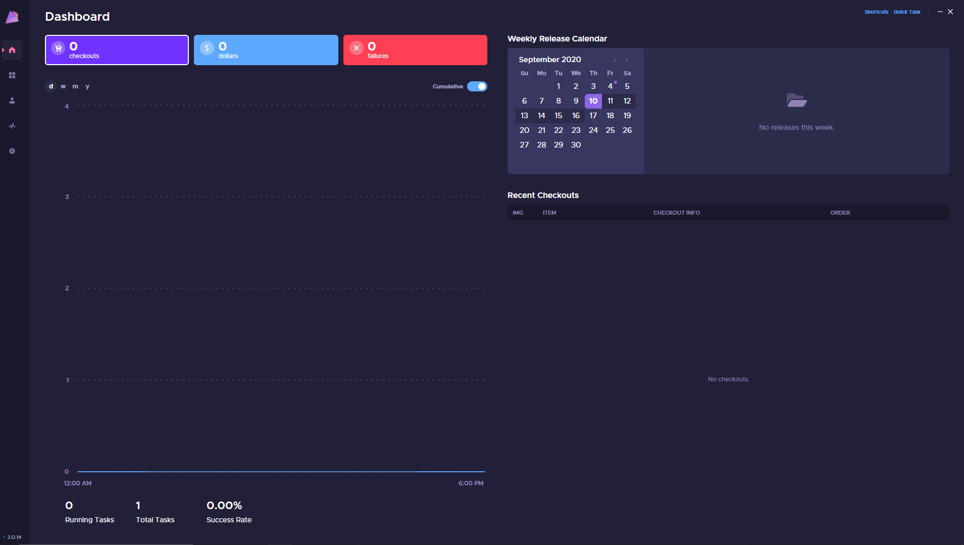 The dashboard page within Prism holds a lot of cool features for the users to take advantage of. The first one of them being a detailed breakdown of how many checkouts, dollars spent and failures you have had across a given time period. Once you select the time period it is illustrated on the graph for the user to understand very easily. On the right side of that the users can utilize an integrated weekly release calendar to stay informed of future releases that you can use Prism on. Below that you can also see your recent checkouts so you can keep up to date with what you have purchased in case you are running a large amount of tasks for a drop.