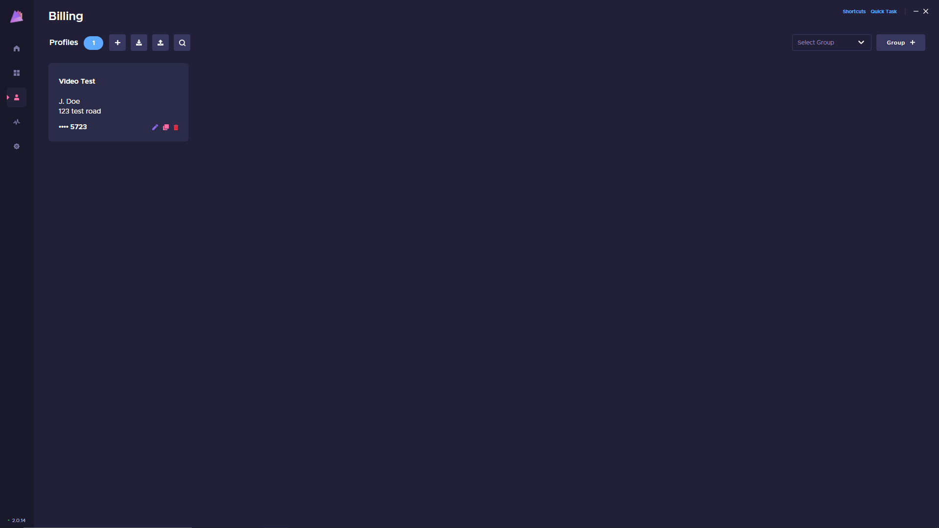 On the billing page you can create billing profiles that will be used with your tasks. Once you create a billing profile they will all appear here for you to view with the billing profile name being the main way of distinguishing each other apart but also the first and last name abbreviated as well as the first line of your address and the last 4 digits of your account number