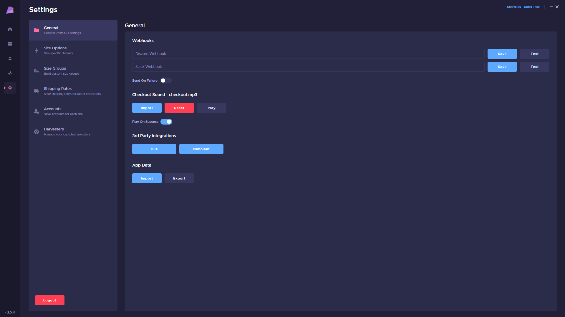 On the settings page you can configure quite a lot about the bot to truly match it to your preference. On the general page you can configure webhooks as well as the checkout sound for Prism and it also is home to a really cool feature they introduced with 2.0 which is their 3rd party integrations section. In this section you can configure philips hue or a nanoleaf to sync with your bot so it will react when it performs certain things. On the site options tab you can configure options for selected sites to create a quicker process for yourself. The size groups, shipping rates and accounts section are quite self explanatory however, on the harvesters page you can add harvesters to be used with your tasks within Prism.