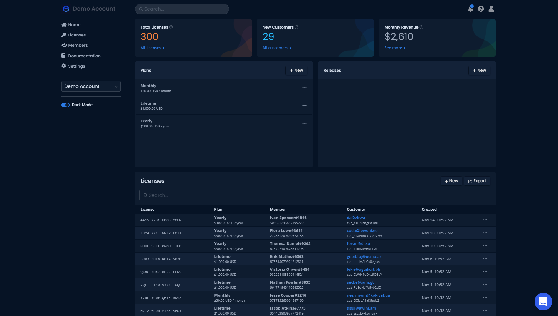 On this page you can view all the licenses in your group and what details are available with them. You will see the license, the plan the member is on, the member with their discord ID below, the customer data and the data it was created. When you click the three dots next to each license you can send an email receipt, you can manage the subscription, clear metadata, unbind their license, revoke license and copy their ID. This allows the group owner to completely manage their members effortlessly from the dashboard.