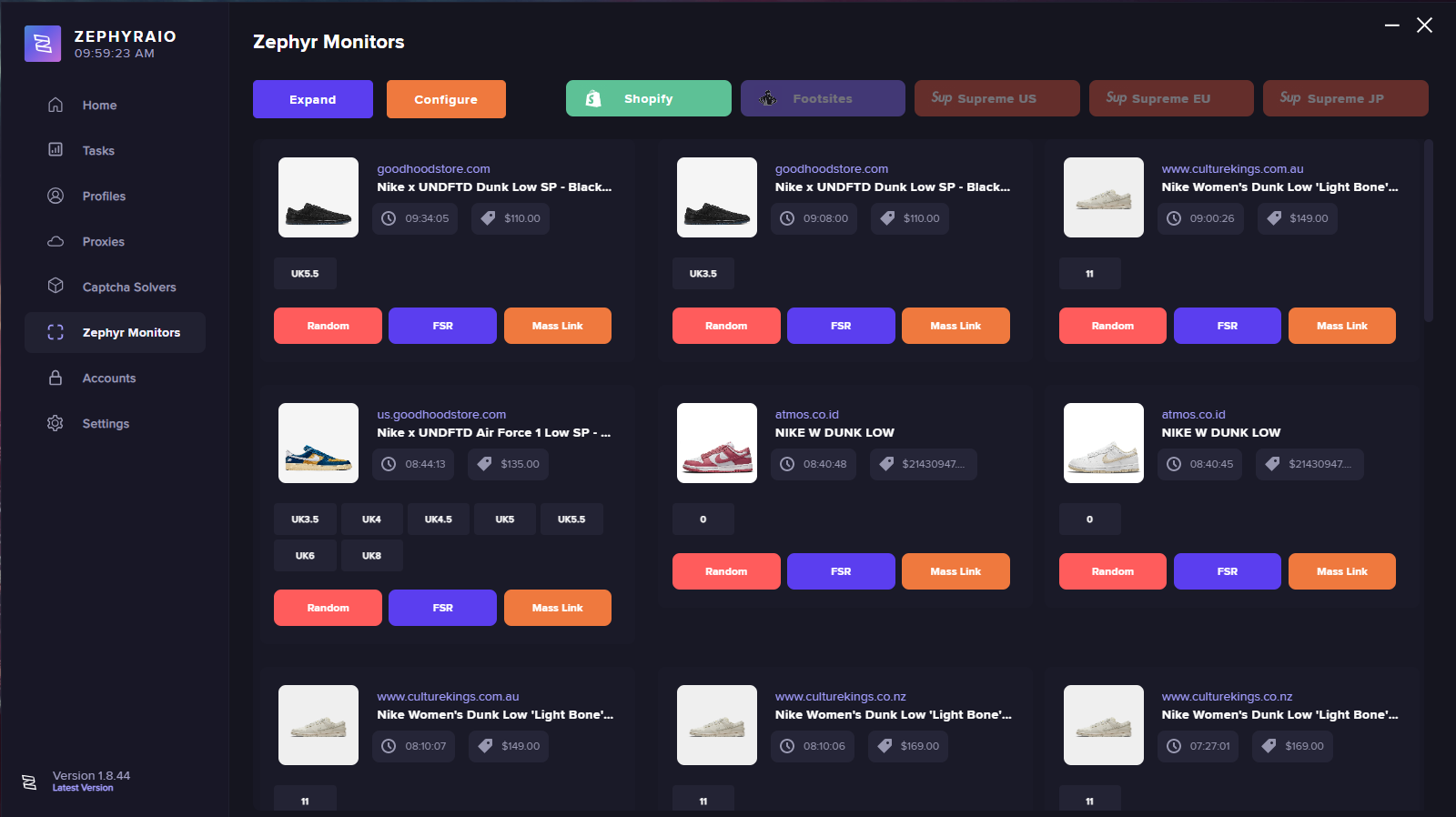 On this page within Zephyr AIO, you can view the Zephyr Monitors section of the bot, this will essentially show products across a ton of supported sites within the software. On each item that comes into the monitor page, you can view the product item, the size of the product, the time it appeared in the monitor, the retail price and the buttons below can be used to launch tasks from them. You can filter the items that come through the page by clicking on the buttons at the top of the page that will only show results for certain sites. You can configure the quick task settings using the “configure” button and you can expand the page into a window by clicking the “expand” button.