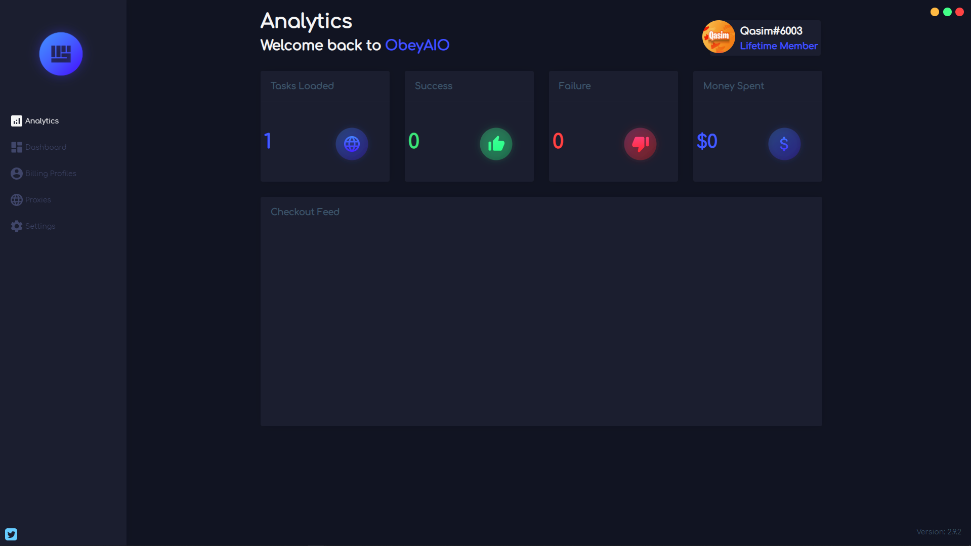 On this window within Obey AIO, you can view the analytics within the bot based on your activity within the bot. You can view how many tasks are loaded, the successful tasks, the failed tasks, the total money spent and finally, the checkout feed below.