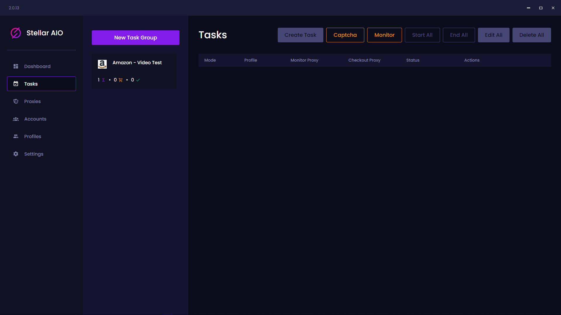 On this window within StellarAIO, you can view the tasks that are created within their specific groups. Inside the task group you can create tasks, view the tasks you create, open up the captcha harvester for the tasks, open up the monitor list which is a very useful feature and finally, take advantage of the collective action buttons on the tasks page.