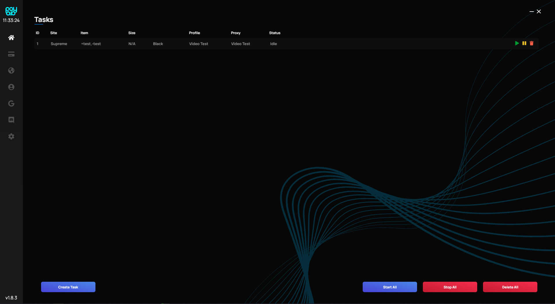 On this window within PayAIO, you can create and manage your tasks within the application. All your created tasks go under a variety of headers in relation to the task and you can create the tasks with the creation task button in the bottom left. You have a few buttons on the task itself which are start, stop and delete. Finally, you have a few collective buttons such as start all, stop all and delete all.