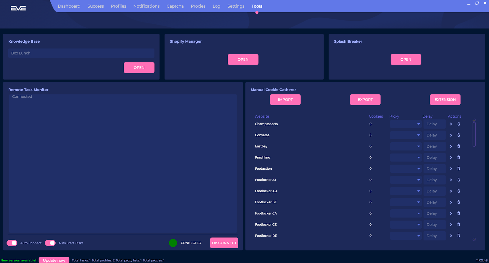 On the tools page there is a bunch of features that the user can take advantage of such as manual cookie generation for the support sites within EVEAIO. With that there is also a remote task monitor to take advantage of and a knowledge base to help users. With the shopify manager you can add shipping rates to all supported sites and with the splash breaker you can create browser sessions on a URL you enter.