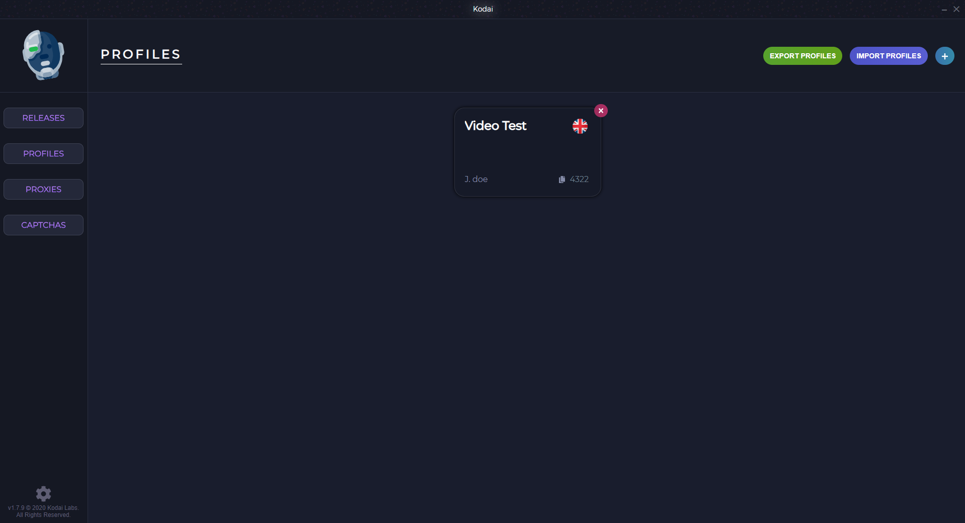 On this page within Kodai you can create profiles that will be used with your tasks inside of the bot. You have the option to import profiles into Kodai and also export profiles out of Kodai too. Then you can create a profile and it is available to view on the page segregated into mini squares with a few details so you’re able to distinguish profiles apart from each other. You’re given the ability to give a profile a name and also select a region for the profile.