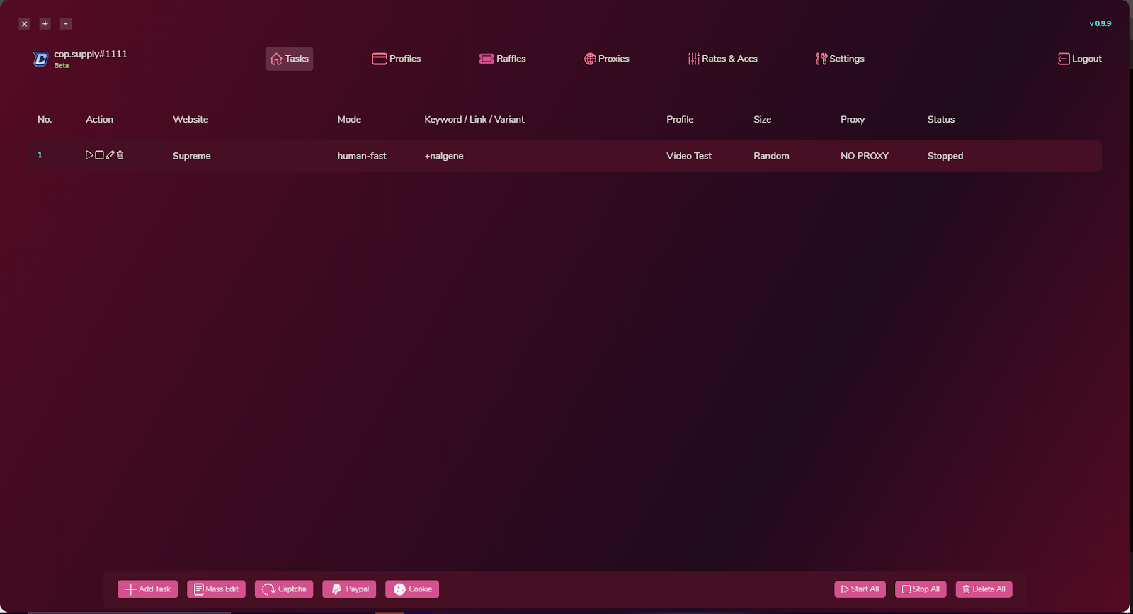 On this page you can view and create tasks in accordance with your specification, certain parts of the tasks have been separated into buttons which you can view at the bottom left. Once you create a task it tells you the number position of the task and with this you can view all the available actions for the task which is staring, stopping, editing and deleting it. The website for the task is shown there as well as the mode, keyword/link, profile being used, size, proxy and the status of the task. You have some collective buttons at the bottom that will affect all your tasks such as start all, stop all and delete all.