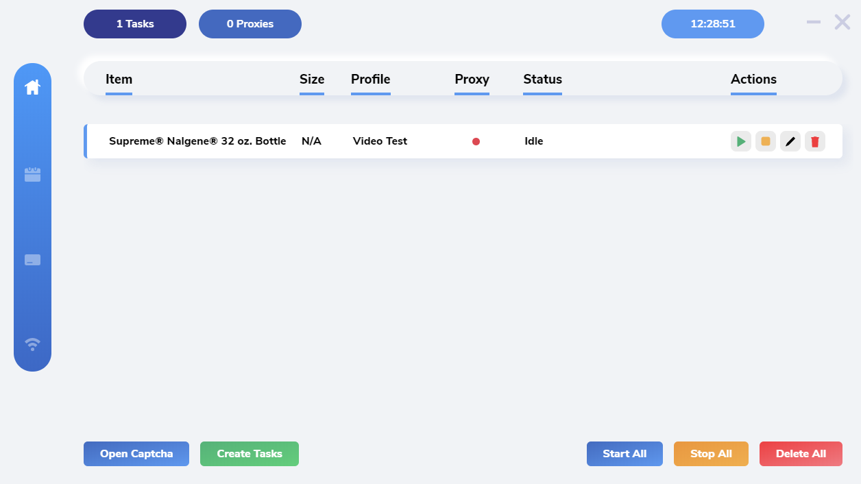 This is the tasks page within Spectre Supreme, on this page you can view all the created tasks from the calendar page but also create tasks manually if you wish to. Once a task has been created you can view the item, size, profile being used, whether a proxy is being used, status of the task and the actions associated with the task. At the bottom of the page you have buttons that will affect all the tasks such as stopping all your tasks, starting all of them and deleting all of them. Finally, you can then open captcha harvester so the captcha is sent from the tasks during the checkout process to the harvester to be solved.