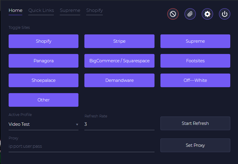 Supported sites: Supreme, Shopify, Demandware, Shoepalace, Stripe, Panagora, Bigcommerce, Off–white and Individual sites.
